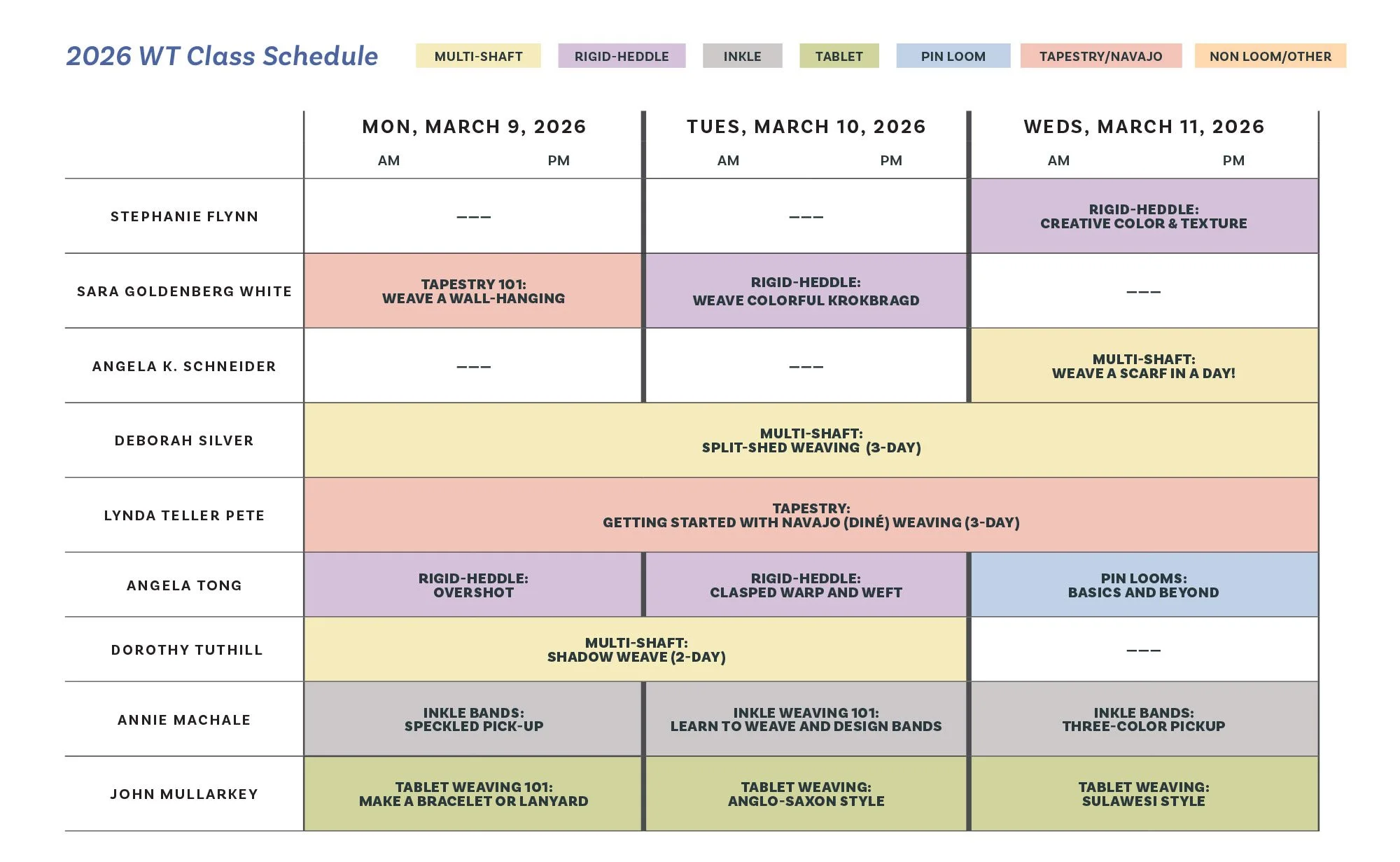 Classes will cover a variety of looms and topics each day, with many options to choose from as you build your schedule. Whether you are a multi-shaft weaver or love small looms like pin, inkle, tapestry, or rigid-heddle, we’ve got classes with expert instructors that fit your interests.